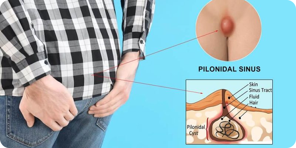 Pilonidal sinus is a chronic skin condition that forms in the crease between the buttocks, near the tailbone. It commonly affects adults in the age group of 16–45 years and is more likely to occur in individuals who sit for long periods or have thick body hair.